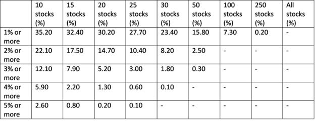 The book covers several investors (like Warren and Charlie as well as Lou Simpson and John Maynard Keynes among others) and also the statistics behind concentration (we encourage you to read it!). Intuitively, the fewer stocks you own, the more your portfolio can deviate from the benchmark’s performance. But how different could it be? What’s the difference between 10 and 30 and 250?