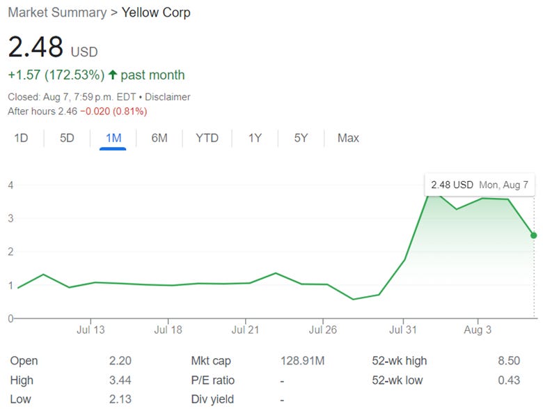 Another case study of the increasing dangers of shorting failing businesses. Yellow Corp declared bankruptcy, but not before its stock rallied 170% or so, reportedly due to “meme” investors. We continue to not short companies, maybe the odd put.