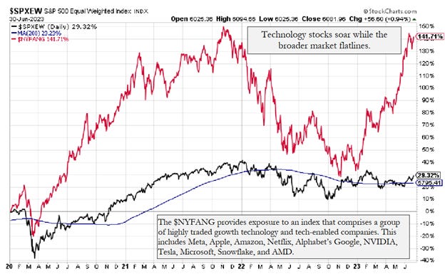 At its current price of $423, Nvidia is valued at forty times its annual revenue. If one heroically assumes that the company manages to compound revenue by 50% per year for three years, it will "only” trade at a multiple of twelve times hypothetical sales in 2026...hardly a screaming bargain. Of course, market history has an interesting way of repeating itself. The most exaggerated technology bubble occurred in 1928-29 when the Radio Corporation of America (RCA) captured the imagination of every speculator on Wall Street. RCA’s trading volume sometimes accounted for 20% of the total volume on the New York Stock Exchange. At the stock price peak in September 1929, the company was "valued" at $665 million. Sales increased from $65 million in 1927 to $102 million in 1928 to $182 million in 1929. Therefore, at the peak of the RCA stock buying frenzy, the company was "valued" at a multiple of "only" 3.6 revenue. Forty-five years later, in 1974, RCA’s annual sales were $4.6 billion, yet the stock price bottomed that year at $38, about one-third of its 1929 stock price high.2 While most rational investors consider Nvidia ‘slightly’ overvalued, market momentum could push fantasy valuations higher. Comparing the 1929 period of RCA and the current situation with Nvidia in 2023, one observes a similar pattern where most stocks experience decline while a handful of large companies powered the major indices higher. In both instances, unsuspecting investors maintained the illusion that the "market" was healthy.