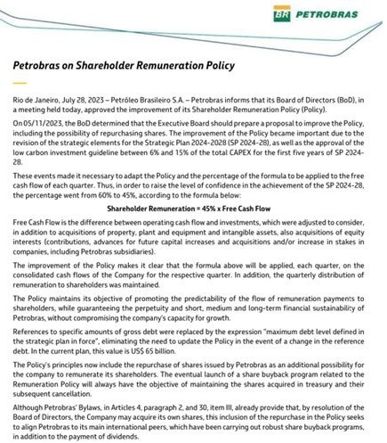 “Rio de Janeiro, August 7, 2023 – Petróleo Brasileiro S.A. – Petrobras, in relation to the news released in the media and as disclosed to the market on 06/01/2023, informs that the Strategic Plan 2024-2028 will have as a driver, among others, the forecast of low-carbon CAPEX for the range between 6% and 15% of the total CAPEX for the first five years of the new Plan, in compliance with current governance practices, the commitment to value creation and the Company's long-term financial sustainability.