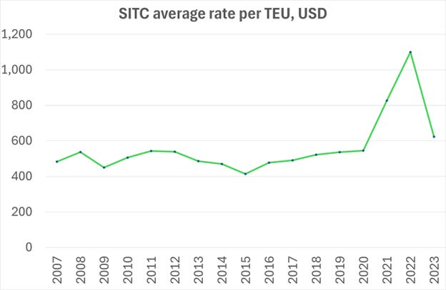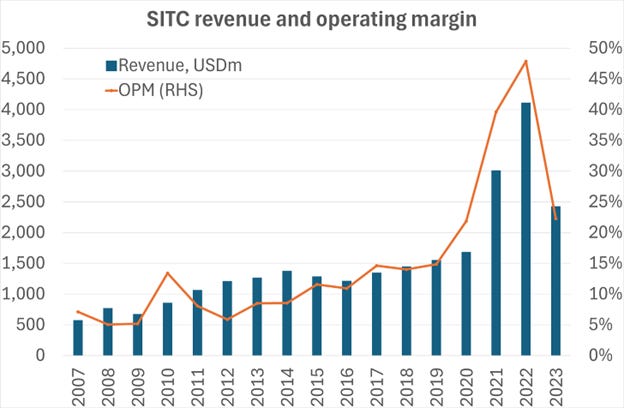 SITC was nicely profitable every year during the tough 2010s, when overcapacity dogged the industry and forced peers into losses. Then when freight rates spiked due to COVID, the boom generated multi-billion dollar windfall profits and dividends, and also whipsawed the stock.