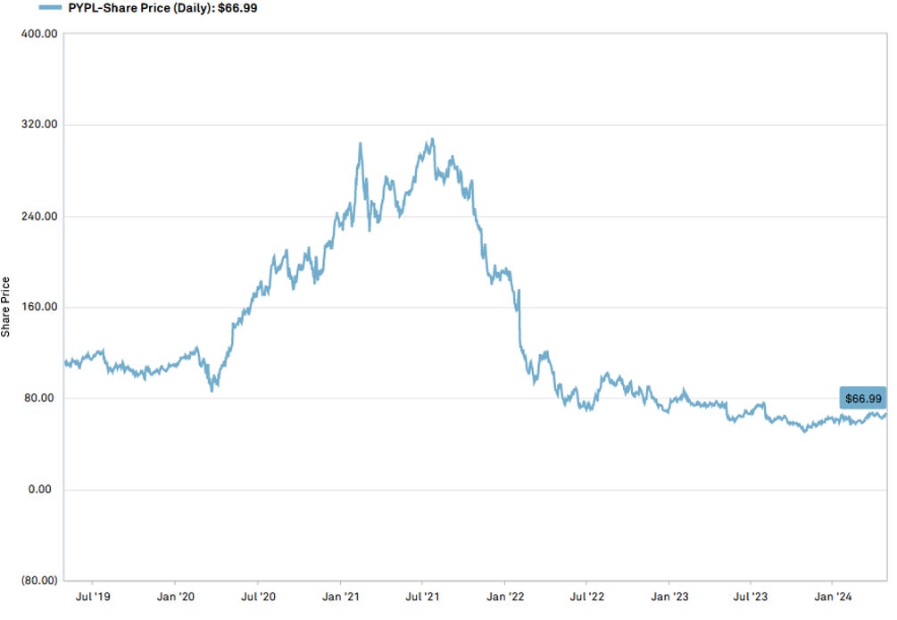 No position. Paypal is a potentially interesting opportunity given the extent of its crash since the COVID boom. The share price collapse is pretty remarkable, and the P/E multiple has declined from almost 80x to 10-15x (depending on your forecast). Wedgewood has an interesting overview in their Q1 2024 letter of the COVID boom when they sold out and why they are re-buying now. https://wedgewoodpartners.com/investor-resources/