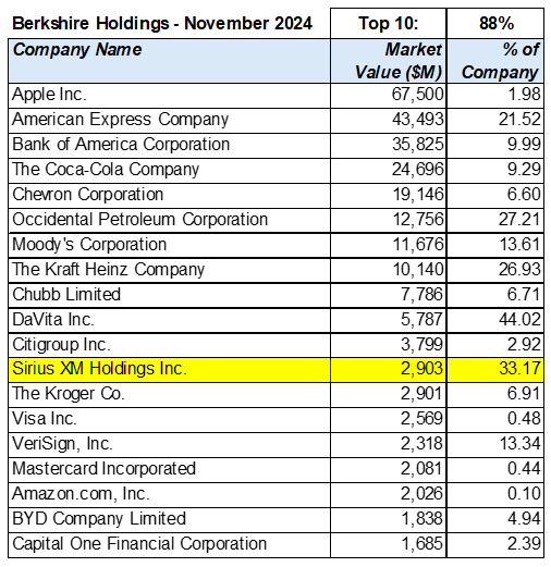 Although the stock has performed terribly, Berkshire has continued to buy through the end of October (see Form 4 below) and now owns about 33% of the company. The most recent buying was during the last week of October. It does not quite break the top ten holdings of Berkshire. However, at ~33%, it is the second largest percentage of ownership of a public company, just behind DaVita (see table below). Maybe we will see a Sirius booth at the Berkshire Hathaway AGM one day.