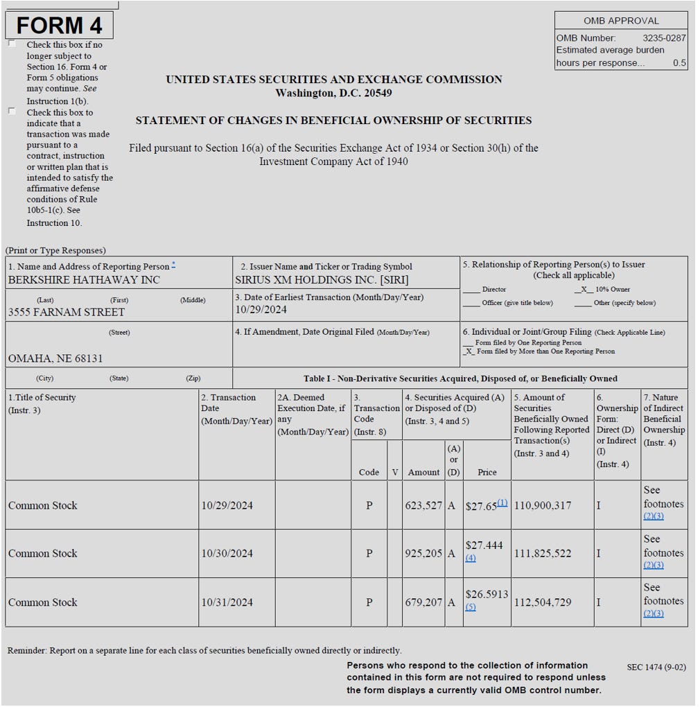 Sirius XM – Transaction closes, Berkshire buys more