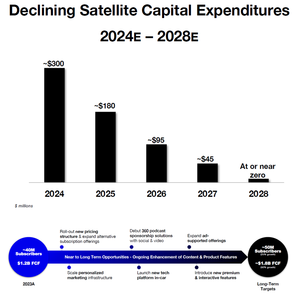 Two key issues are top of mind. 1) The churn rate for Sirius remains very low, but they just have not been able to grow their subscriber base. 2) They are now quite levered due to the transaction. However, capex going forward should decline (see satellite chart) and de-levering should progress now that the transaction is out of the way and Sirius finally has a normal simple capital structure.