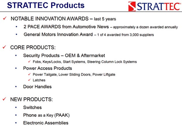 Strattec has been a separate public company since 1995 when it was spun off from Briggs & Stratton. The Company primarily makes car door handles and locks, but more recently powered lift gates. GM recognized them for their collaboration on the powered lift gate for the Silverado - https://www.vastglobal.com/General-Motors-Honors-STRATTEC--as-Winner-of-Coveted-Supplier-Innovation-Award-_6982.aspx