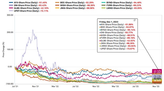 It is an amazing list to have shorted in 2021. Here is a stock chart of the top 10 to-date. To be fair, they all still have a few decades to turn it around. Top ten details at the end. TLDR; a lot of money would have been lost if you held the top ten shown below.