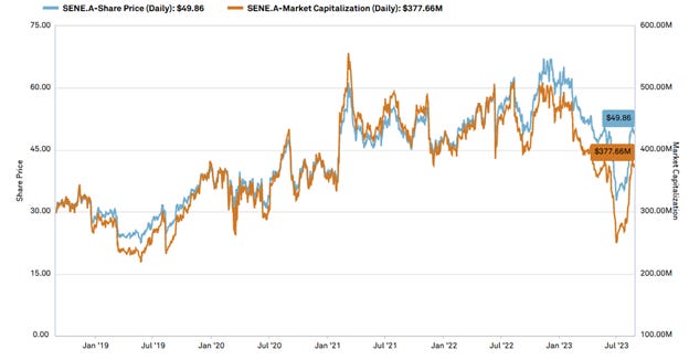 Seneca is our kind of boring company. It produces canned and frozen vegetables and fruits and has been operating since 1947. It has historically not been a great business to be in, but recent performance, share buybacks, and industry dynamics have made it interesting. We argue: