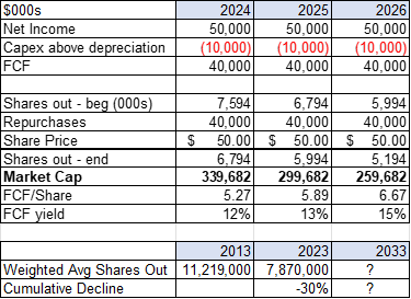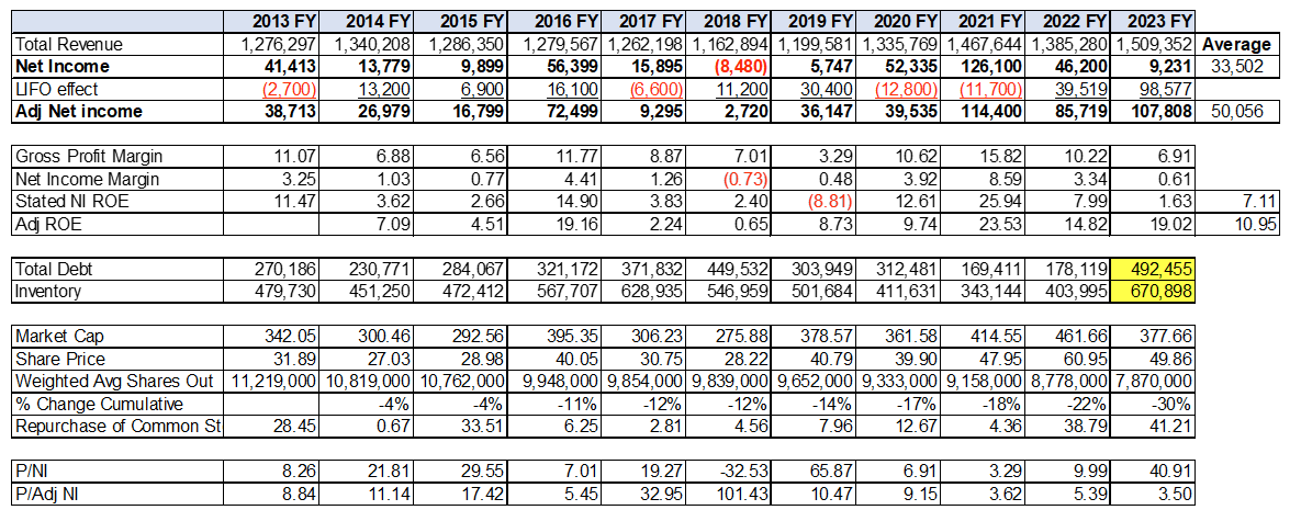 What if things normalize, margins really aren’t that great, but management keeps repurchasing shares? Here’s what it might look like. We note that cash capex on average exceeds depreciation and that earnings could never reasonably be assumed to be smooth over several years, but might just work out on average. This also ignores the underlying argument that there is value in the underlying physical assets. Stated book value is ~$70s, and $90s when adjusting for real life inventory value, while various owned facilities and land are likely held much below current replacement cost/market value. Maybe not so bad indeed.