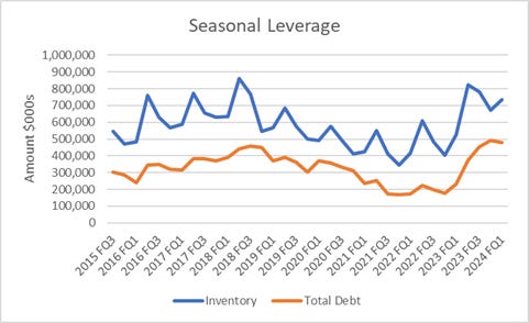 They are being impacted by higher rates, but it appears manageable. Leverage is seasonal and the recent bulge, and leverage in general, is driven primarily by inventory and secondarily by acquisitions (more so in the 2000s).