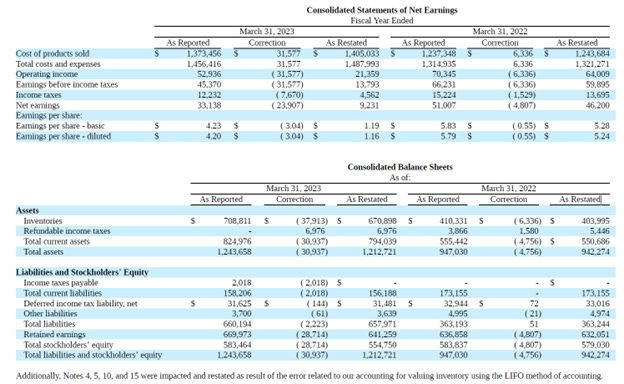 On July 25, 2023, we reported that we had identified an error related to our accounting for valuing inventory using the LIFO method of accounting as of March 31, 2023 and 2022. An actual valuation of inventory under the LIFO method is made at the end of each fiscal year based on the inventory levels and costs at that time. During the formulaic valuation of actual inventory values at fiscal year end, incorrect quantities were applied to the calculation which resulted in an understatement of the LIFO reserve as of March 31, 2023 and 2022. Management determined that correct LIFO quantities were applied to the actual valuation of LIFO at year end prior to fiscal year 2022, as only trivial differences were noted during Management's examination. In contrast, interim LIFO calculations are based on management’s estimates of expected year-end inventory levels, production pack yields, sales and the expected rate of inflation or deflation for the year. The interim LIFO calculations are subject to adjustment in the final year-end LIFO inventory valuation.
