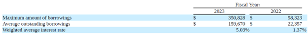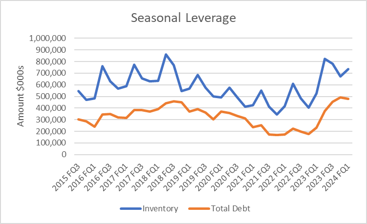 They are being impacted by higher rates, but it appears manageable. Leverage is seasonal and the recent bulge, and leverage in general, is driven primarily by inventory and secondarily by acquisitions (more so in the 2000s).