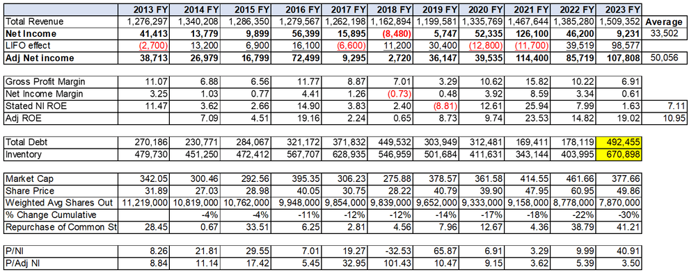 -It is trading at low adjusted earnings multiple, can be argued to be a net-net depending on your perspective of inventory and physical assets. More importantly, with continued share buybacks this might be quite good. But, earnings volatility and tough industry dynamics do give us pause.
