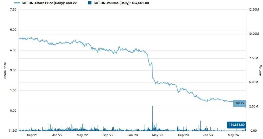 For those not following the office space real estate market, things are not going very well. For Slate Office REIT (TSX:SOT), things have been going particularly poorly. On June 25th, the Company, which owns ~50 of mostly office properties spread out across Eastern Canada, Chicago, and Ireland, announced that payments on their convertible debentures are now being blocked by senior lenders. However, what makes this situation interesting to us is a key investor, G2S2, has just taken over the Board after a two-year battle and has a track record of creative turnarounds. The publicly traded convertible debentures now trading at 20 cents on the dollar provide (we think) an interesting opportunity. But is it too late for G2S2 to fix this?