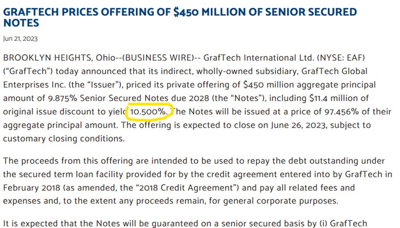 We posted about Graftech on May 28th (see member post). Oof. First, operational hiccups at Graftech $EAF last year are still hanging around causing sales problems almost a year later, and now another $25MM a year of CF disappearing to higher interest costs vs a year ago. This effectively covers the term facility so at least covenants probably aren’t a concern now. Still on the sidelines. https://www.graftech.com/investors/news/news-details/2023/GrafTech-Prices-Offering-of-450-Million-of-Senior-Secured-Notes/default.aspx