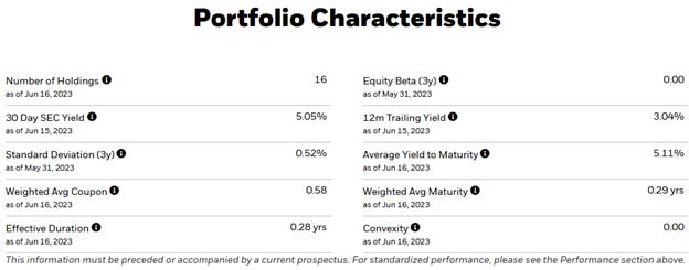 We usually do not carry much cash, but sometimes we are between ideas and trades. One place to park your cash is ishares short-term treasury ETF, SHV. Why SHV? It only holds U.S. Treasury bonds that mature in less than 1 year, so you have very little duration risk. Current yield to maturity is 5.11%.
