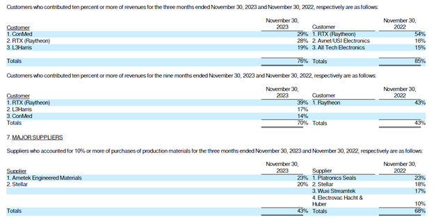 As we noted last summer, the Company stepped out of its core business into a somewhat related business, acquiring Micro Engineering, Inc. (see June 2023 update). As expected, more than half of MEI’s sales are to one customer, ConMed. You can see the before and after impact on customer concentration below: