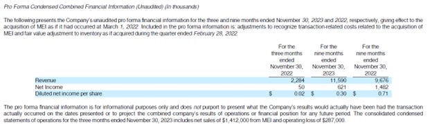 November 2023 Note - Net bookings for the three months ended November 30, 2023 increased 115% to $4,842,000 versus $2,257,000 during the three months ended November 30, 2022. Backlog as of November 30, 2023 increased 102% to $12,986,000 as compared to a backlog of $6,430,000 as of November 30, 2022.