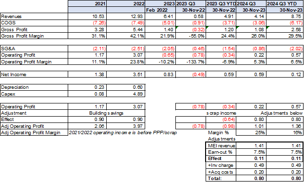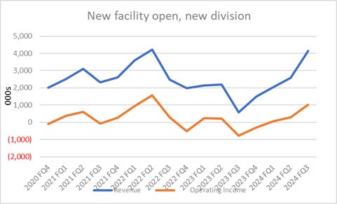 As a reminder, their core manufacturing business is power transistors and control modules primarily as a small but absolutely essential input into various weapons systems. It was historically run out of one leased facility, but in 2021 (under new leadership) they decided to find and purchase their own facility. They built up stock, closed down the old facility, and moved the equipment to the new facility. The move was done in the three months ending November 2022, or Q3 FY2023 (year-end is February to add to the confusion).