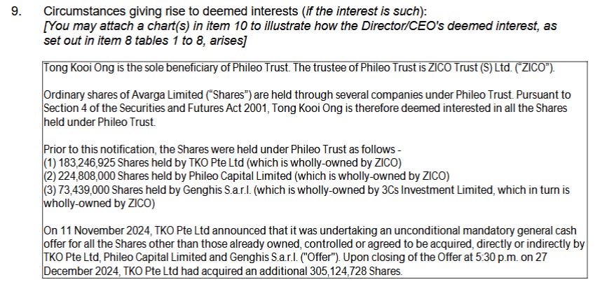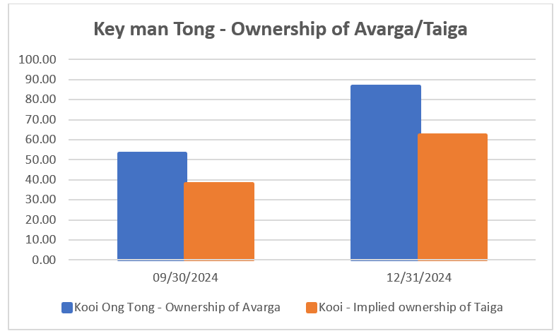 As we noted previously, their key owner Kooi Ong Tong was focused on Avarga last year and tried to take the parent Avarga private in December. https://www.canadianvalueinvestors.com/p/cvi-update-exited-talen-energy-taiga It was just short at ~87% vs the 90% threshold, and he is now dealing with two stuck public companies. His implied flow through ownership of Taiga is as shown below. Avarga today is trading at around the failed offer price of S$0.25/share, implying an EV of ~$250MM Canadian versus their share of Taiga at $310MM. We previously owned Avarga, but have opted to just hold Taiga for now to be closer to the business and its outcome (this is subject to change).