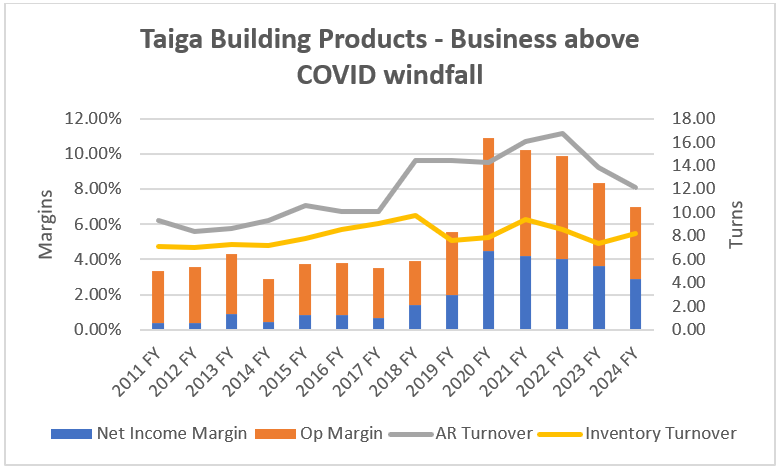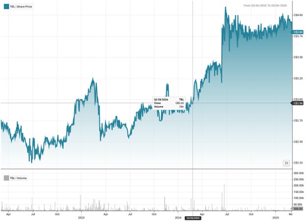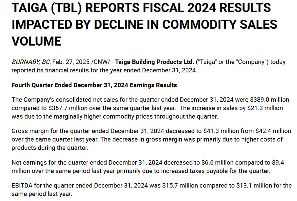 We have followed Taiga Building Prodducts for a number of years now and have written about them extensively. In fact, it has been almost exactly a year (February 28th, 2024) since we wrote Taiga Building Products TSX:TBL – Single digit P/E and the cash pile grows… now what? https://www.canadianvalueinvestors.com/p/taiga-building-products-tsxtbl-single when they were trading at ~$3 (now ~$4).
