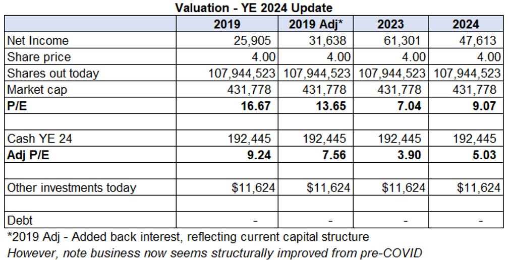To recap previous posts, we think the business was surprised by the COVID windfall (as was the rest of the industry). They have done acquisitions previously and did them well, but COVID windfalls also caused valuations to stretch to a point that they were likely unattractive, while dividend distributions are inefficient for the parent (though they made one in 2023 - $25MM).