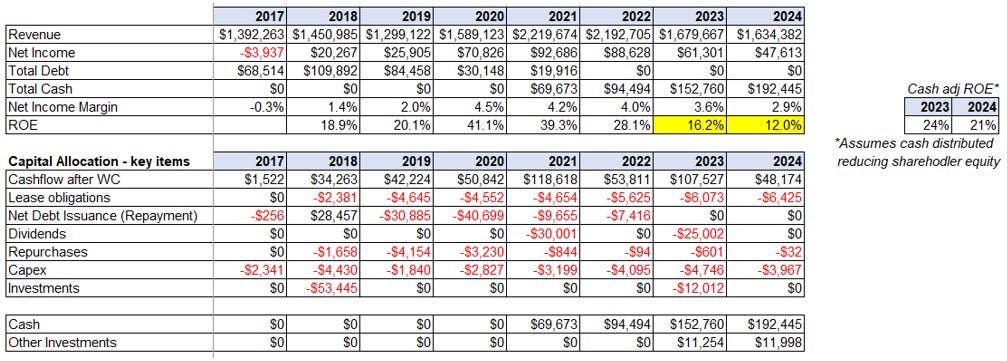 The business really seems to be structurally improved now – we are quite removed from COVID pricing issues in building supplies – but the Company’s return on equity is now significantly impacted by them holding too much capital in the business. It is cutting the return in half. The issue is the business simply cannot utilize the cash that it is generating internally.
