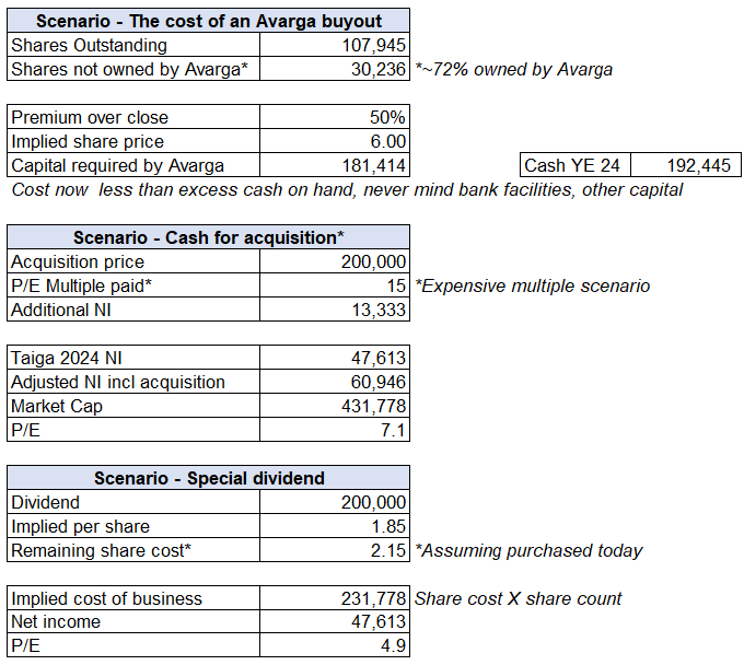 We do not believe this is stuck money, just slow money. The Avarga go-private offer was serious, almost made it, and would have allowed them to either better manage Taiga directly or then take Taiga private. The numbers are remarkable to us. The Taiga cash surplus is now so high that Avarga could make an offer to buy out minority shareholders at 50% above today’s price, never mind using a bit of leverage or other capital. The business today has a general purpose unused $250MM credit facility.