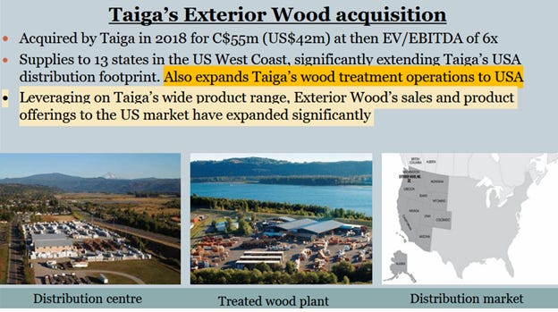 Maybe it is all about acquisitions? Avarga provides some color here – Per 2018 letter, “you might ask why then did Taiga acquire Exterior Wood in the USA. This strategy to expand to the pacific west coast of the USA has been in the making for years and it is not often the right opportunities turn up. In this case, it came about with the recent passing of the owner. The valuation was decent. The business model was similar, and we could add on products into the distribution channel.” And in 2019 – “While we extract most of the net cash flows from our paper and power businesses, we believe Taiga is at a stage where it needs to reinvest its capital and grow its operations. As I pointed out earlier, restructuring Taiga’s balance sheet led to the acquisition of Exterior Wood, which was a major contributor to our performance in 2020.” They were a prudent acquirer in our minds – “We acquired Exterior Wood in 2018 for US$42 million when our data showed the US housing market bottoming out. After full integration of the branch into our network, pre-tax profit for Exterior grew to US$13.0 million from US$6.8 million the year before.”