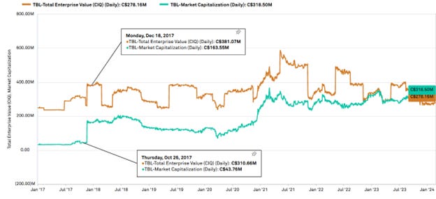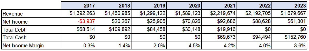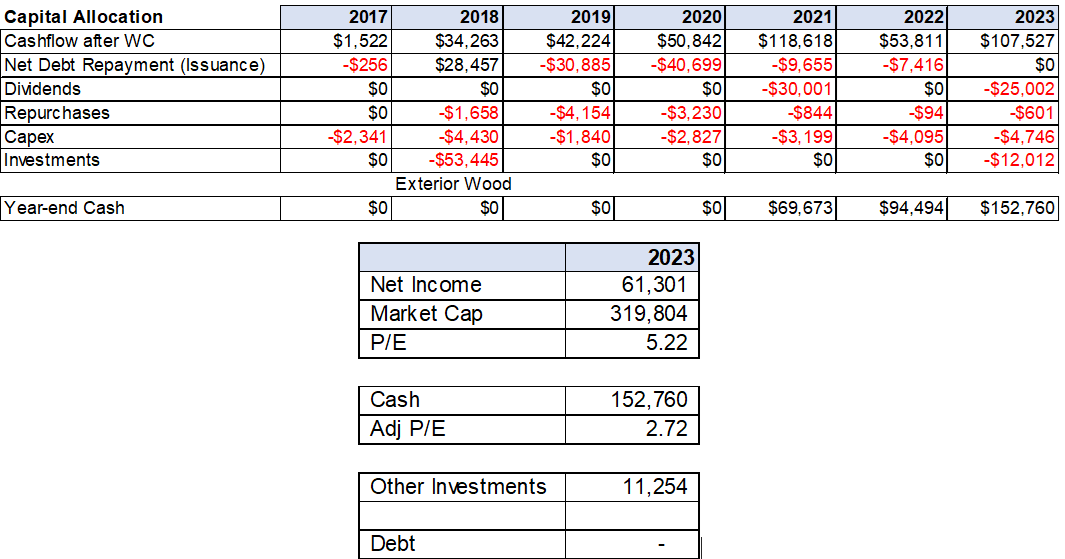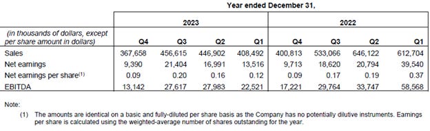 The Company was established in 1973 and is the largest building products distributor in Canada. They also have a wood treatment business division, expanded through the acquisition of Exterior Wood, Inc. in 2018 for $56MM. At the time we wrote about them in early 2022, we argued historical results and COVID obscured the Company’s significant de-levering, acquisition, and operational improvements after a 2017 recapitalization. At a market cap at the time of ~$320MM (and still the same today), they paid a $30MM dividend the previous year (2021), repurchased >7% of their float, resolved a disastrous high interest loan, and were then sitting on ~$60MM of cash and Q3 YTD Net Income of $82MM or 4X market cap.
