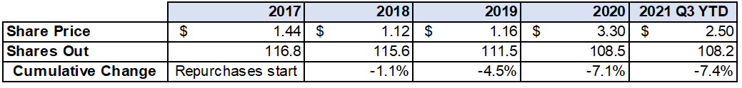 In addition to the one-time dividend last year of $30MM, they also started repurchasing shares prior to COVID and 7% repurchased so far. However, repurchases subsequently slowed down significantly.
