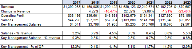 The other point to note is that compensation per employee has risen substantially over the years, in line with profitability. I would say that management are extremely well paid, certainly well above the industry. As the saying goes, you get monkeys if you pay peanuts. Taiga has an excellent management team with a strong sense of ownership and a well-planned succession.