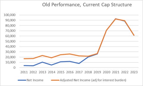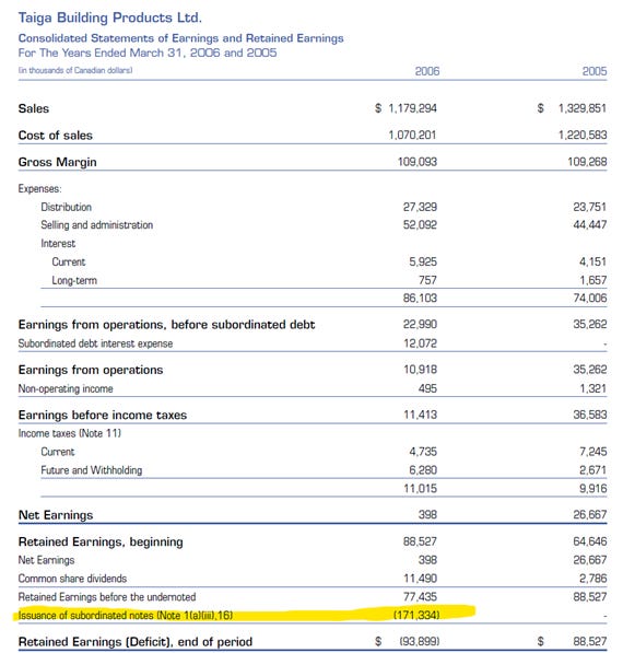 Taiga’s margins and returns on capital have been pretty stable back to the late 1990s. (Note: ROA has improved over time from 1-3% to 3-6%, but calculation of ROE depends on what you consider equity). But where is the actual profit? The problem goes back to 2005/6 when they issued a huge subordinated debt financing (really a distribution) as part of a reorganization.
