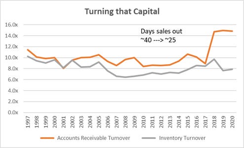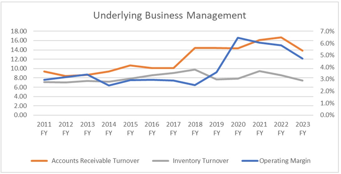 Operational Improvements are pretty straightforward and exemplified by them simply turning AR faster (from ~40 days to ~30 days) while gross margins remain strong and stable at 8-10% (14-20%+ in 2020/21 not sustainable, or at least we wouldn’t want to assume they are).