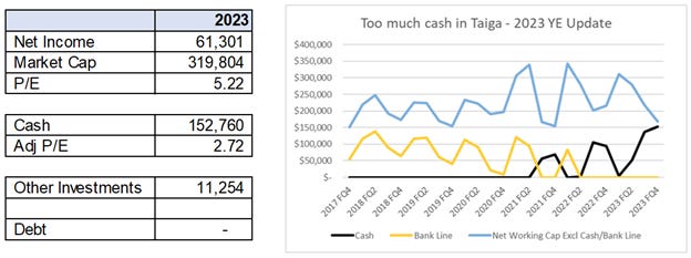What about another dividend, like the $30MM in 2021? We think that Avarga held off on further dividends given: 1) the volatility, and 2) the lack of investment opportunities requiring significant capital at the parent level. Avarga themselves have stopped their own dividend given the market did not care about their dividend strategy in their own eyes (see full Avarga PDF for detailed notes on their capital allocation thoughts). For example, in 2020 Avarga said “as a wholesale distributor with high inventory turnover, it is very unlikely we will repeat last year’s performance as we will not sit on our inventory. Taiga does not and will not make speculative bets on commodities as a business, nor will it become reliant on economic cycles. Acknowledging that, Taiga has paid out a special dividend of C$30 million to its shareholders including Avarga.”