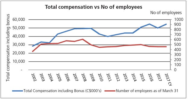 [This chart] shows the total compensation to employees and number of employees from 2002 to 2017. This cost alone is about half of the total operating costs of Taiga.
